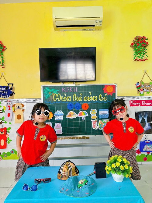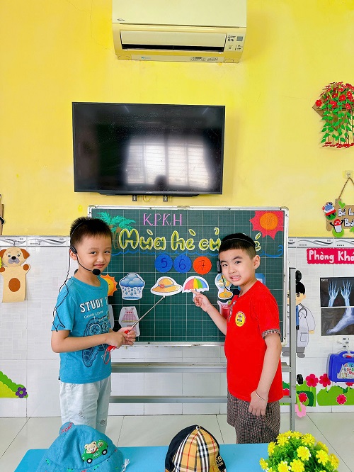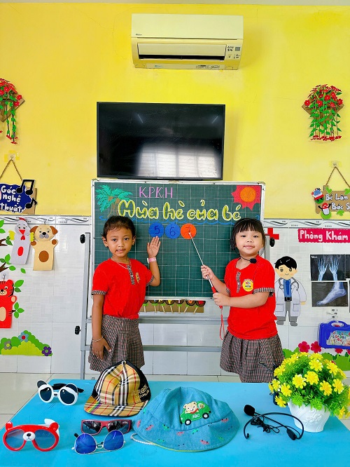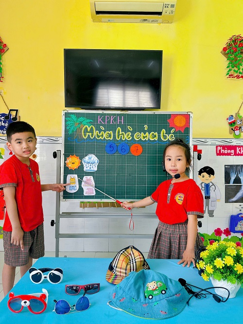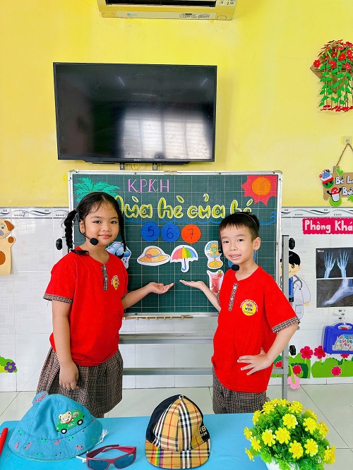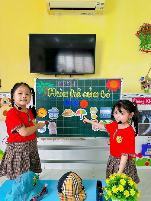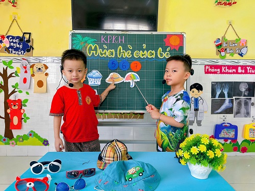 - Các bé giới thiệu: "Mùa hè diễn ra vào các tháng 5, 6 và 7. Trời rất nắng nóng, nhưng đôi khi cũng có những cơn mưa to và sấm sét nữa đấy ạ!"