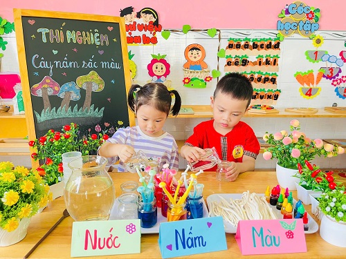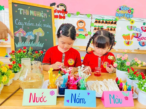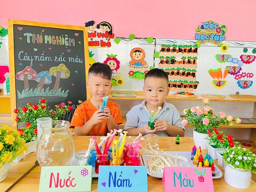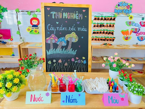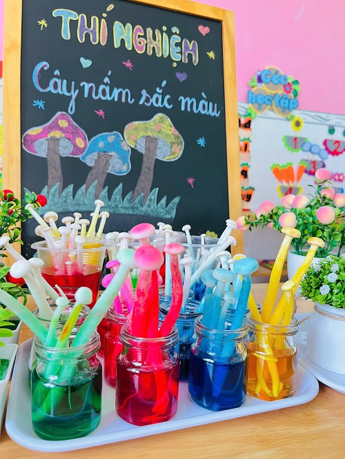 - Chúng con chuẩn bị những lọ thủy tinh nhỏ xinh, pha thêm nước và một chút phẩm màu. Sau đó cho nấm vào và… chờ đợi điều bất ngờ xảy ra